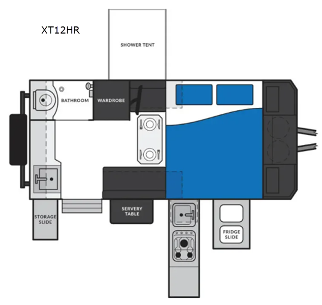 Sleeps 2 Length 18 ft 2 in Ext Width 7 ft 6 in Ext Height 9 ft 10 in Hitch Weight 375 lbs GVWR 6147 lbs Dry Weight 4497 lbs Fresh Water Capacity 42 gals Grey Water Capacity 10 gals Tire Size 265/75R16 Cooktop Burners 3 Number of Awnings 1 LP Tank Capacity 20 lbs. TV Info 19" LED TV Awning Info 9.8' 12V Electric Cassette Axle Count 1 Number of LP Tanks 2 Shower Type Wet/Bath Shower Similar Off-Road Trailer Floorplans
